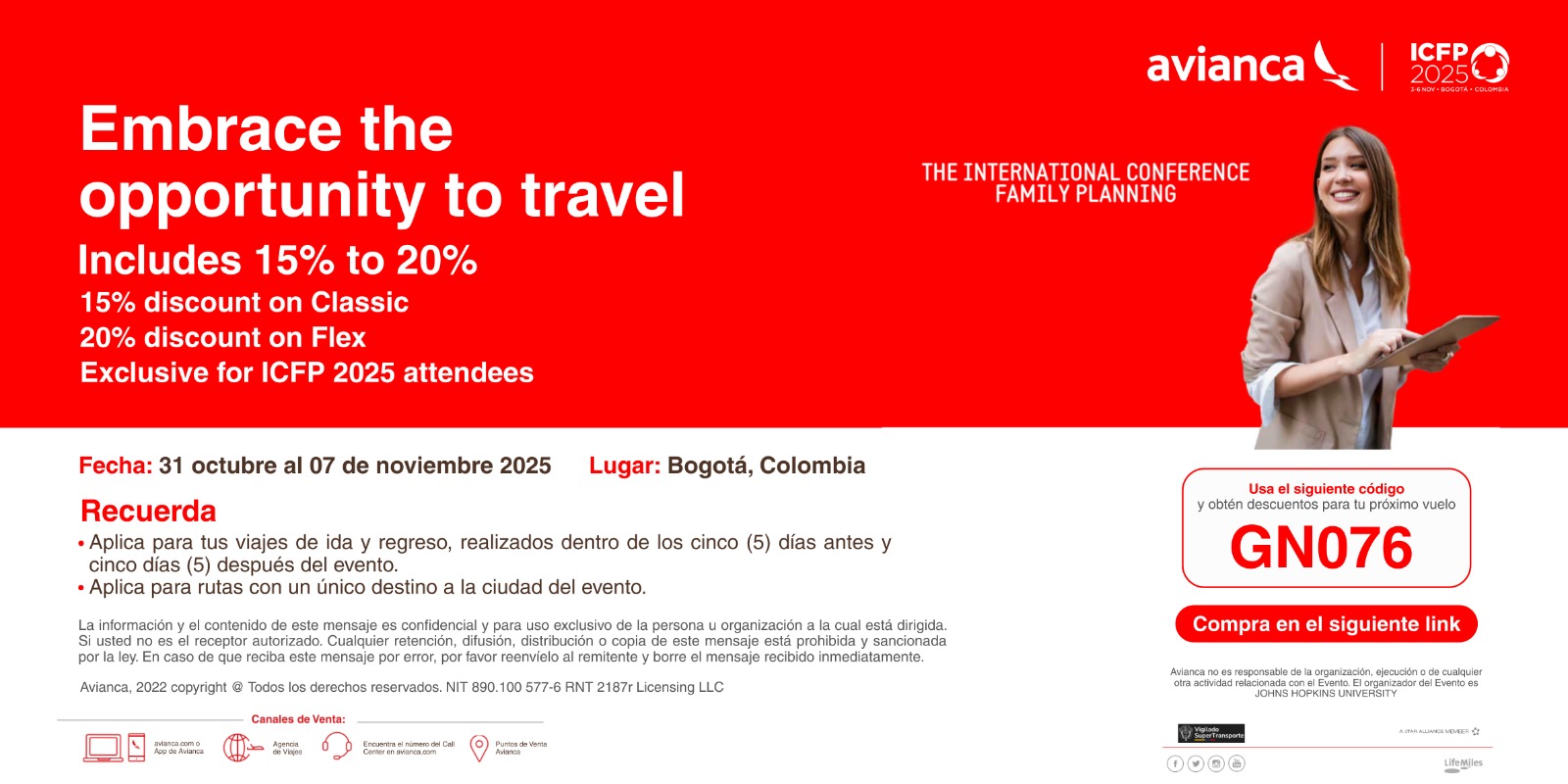 Avianca is pleased to offer special discounts for registered attendees of the 2025 International Conference on Family Planning (ICFP) in Bogotá, Colombia.