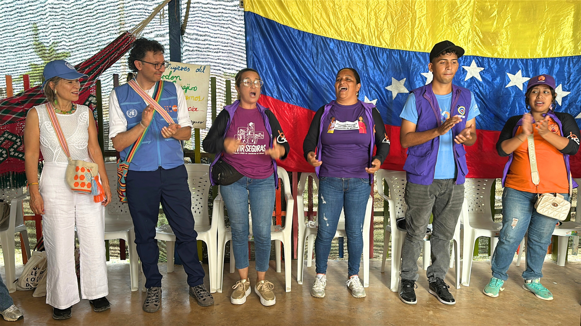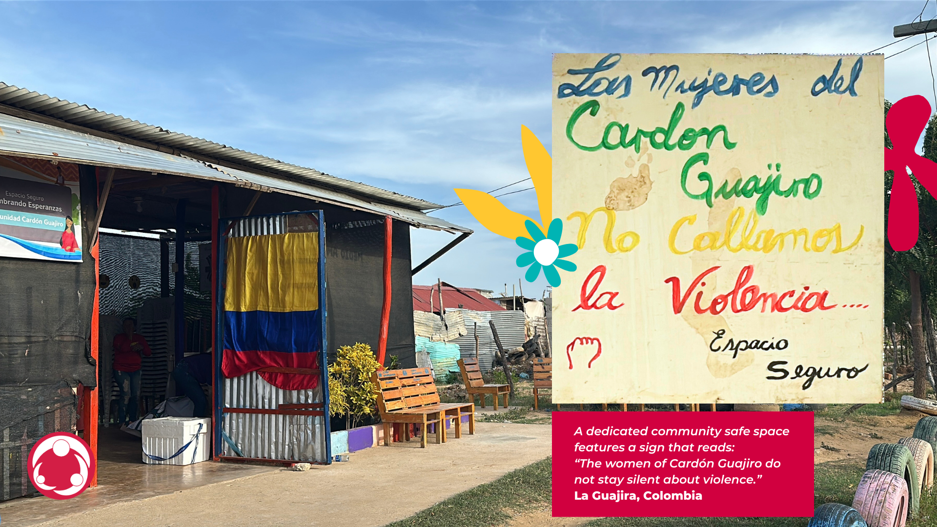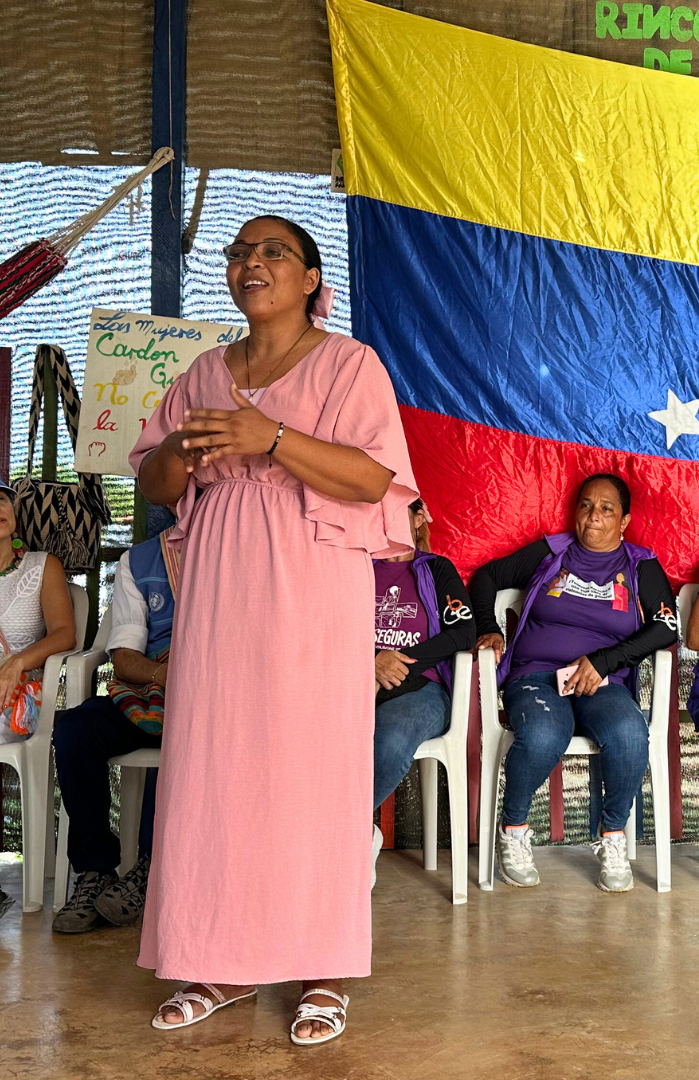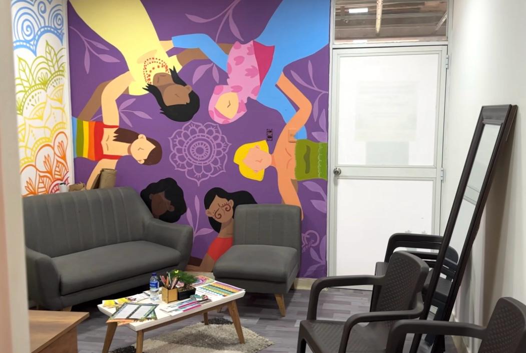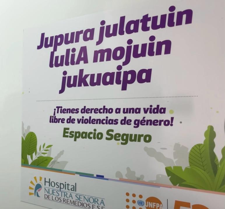 Ouvert en 2024, l'espace de sécurité offre aux survivantes et aux femmes exposées à la violence sexiste des services complets en un seul lieu : soins médicaux et de santé mentale, conseils spécialisés et liens avec les systèmes de justice et de protection. Des marqueurs de pas sur le sol guident les visiteurs jusqu'à l'espace, où un panneau sur la porte indique "vous avez le droit à une vie sans violence sexiste". en espagnol et en wayuunaiki, la langue du peuple Wayuu.