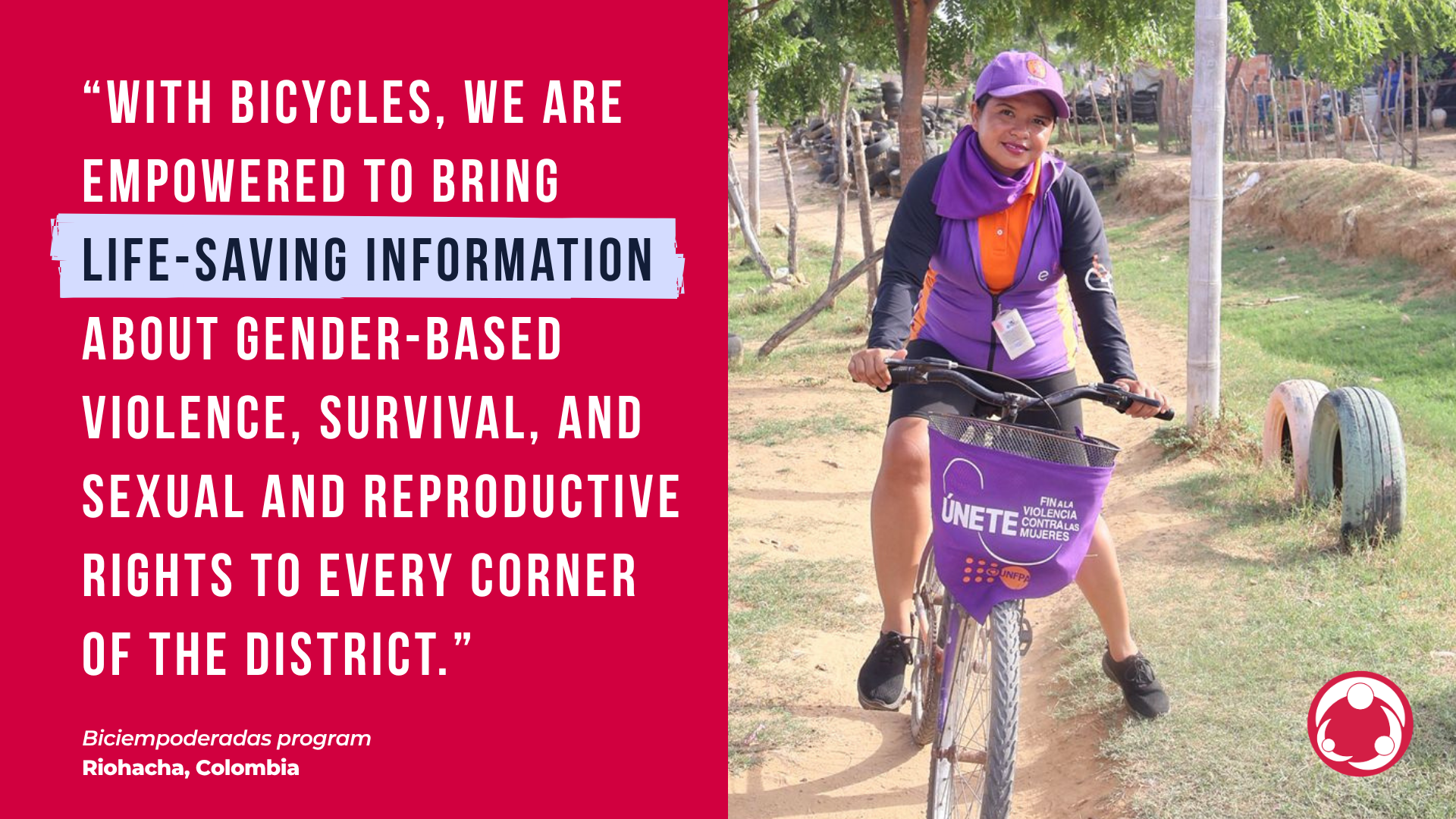 À La Guajira, un groupe de femmes utilise des bicyclettes pour atteindre les communautés, fournir des informations vitales sur la santé sexuelle et génésique et répondre aux cas de violence sexiste. Il s'agit de Biciempoderadas est le programme Biciempoderadas.